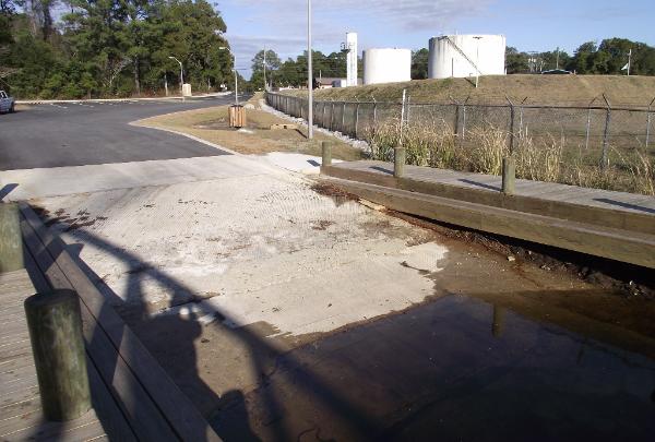 | The concrete portion of the ramp ends just before the end of the wooden loading docks, looks like a dropoff to the creek bottom, unknown heighth. |