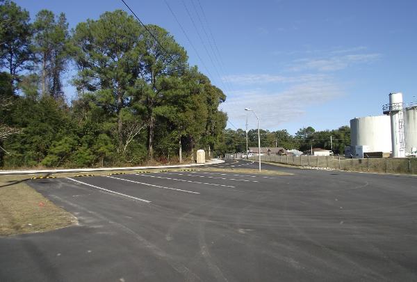 | Paved, marked parking for 7 vehicles with trailers, plus one parking lane marked for handicap. Portapotti across the street, street lamp over parking. |