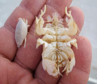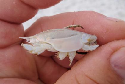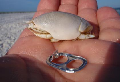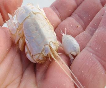 The sand fleas do not get very big - most are around a half inch to an inch long. The females grow up to 2 inches long while the males only grow up to about 3/4 inches long. Mole Crabs have five sets of "legs" on their underbelly. They are used primarily to paddle through the water and to dig into the soft sand. One characteristic of a Mole Crab is that they always travel backwards. They can walk on wet sand to get back to the water, but if they are put in dry sand, they usually will not move. They have no claws as most crabs have. Like other crabs, they "breathe" through gills and must have oxygenated water to live in. They can live out of the water for a few hours to a few days, depending on the temperature and if their gills do not dry out. Located on the rear of the underbelly is the crab's Telson. Locally it is referred to as the "digger". The telson has several purposes: 1) Helps to protect the soft underbelly of the crab. 2) Initiates digging by tactile stimulation of its base. 3) Anchors the sand flea in the sand once digging is complete. If you pull the telson away from a pregnant crab, you will find hundreds of brightly colored eggs underneath. During the reproductive season from February through October, one female can produce one clutch per month of 50-45,000 eggs, which take about 30 days to develop. There is a popular fisherman's belief that the orange eggs on a sand flea attracts pompano and other fish to the sand flea. This is why a lot of people like to use orange or pink colored pompano jigs. The eggs will turn brown shortly before they hatch. Studies have shown that they usually hatch just after sunset and when the waves or tide or high. It is thought that this timing helps to protect the eggs and the high tides assist in carrying them out to sea where they begin their life as free swimming zoea larvae. At sea they drift for 3-6 months and go through numerous developmental stages. As the larvae reach the juvenile stage, the currents begin to wash them up onto our beaches around March of each year. They are around 1/4inches long at this stage and are termed "recruits" by the biologist. They join the older sand fleas that have spent the winter buried deep in the sand near the shore. |