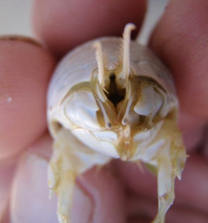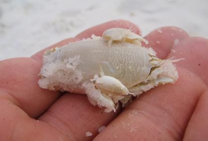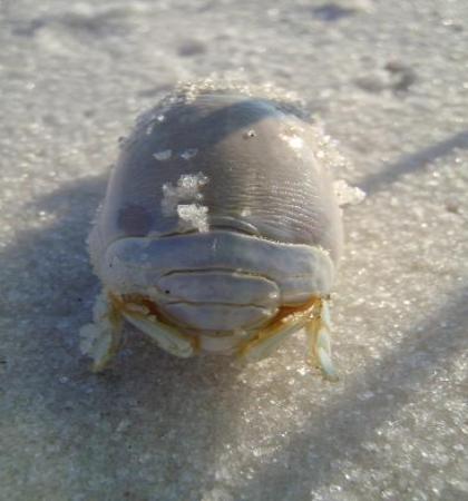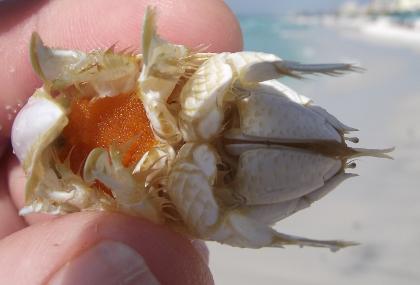 Mole Crabs (aka Sand Fleas) On the panhandle beaches, one bait that is prized by Destin's surf fishermen is the small crab that we call the Sand Flea. It is not actually a flea and will not harm you in any way. No claws and it does not bite. In other parts of the United States, it is referred to as a Mole Crab, Sand Crab, Beach Flea, Sand Bugs or a Sand Fiddler. It is a type of crab that lives in the wet sand at the water's edge of our beaches. Whatever you call it, the pompano, redfish, sheepshead, and other fish love it. |