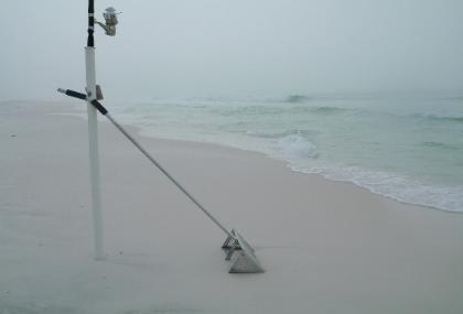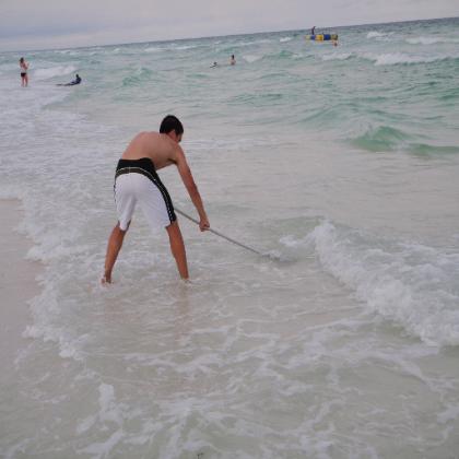 To catch the sand fleas, you simply stand at the waters edge and look down the beach to the area where the water is running off the beach. You will see the tell tale Vs in the sand. Once you see them, run over in the dry sand above them, then wait for the next wave to come. As that wave goes out, run your scoop through the colony. Most people get a "sand flea rake" to catch them with. This is nothing more than a reinforced wire basket at the end of a handle. Lots of videos out there on You Tube and other places that show you how it is done. |