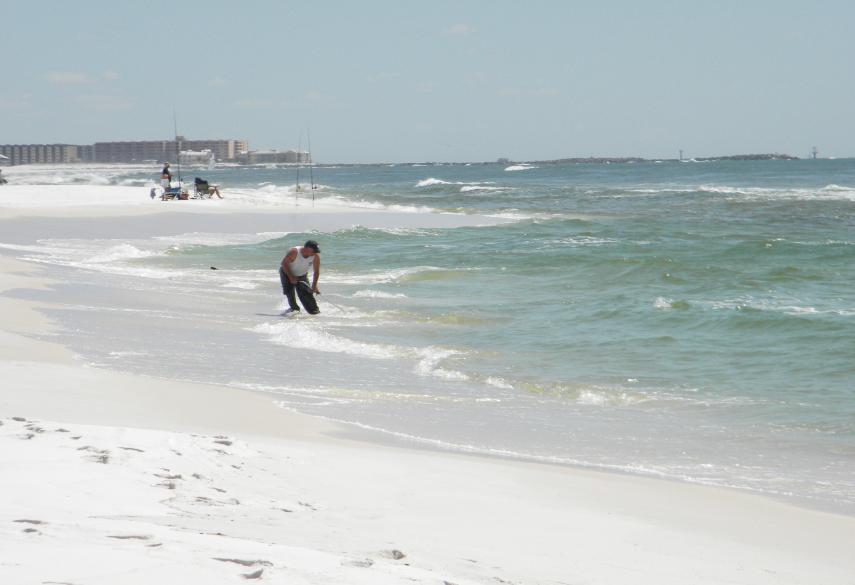 Some tips in closing: The fleas wont always be in the colonies. Generally speaking, they travel a lot in the waves and the current in out area pushes them to the west. Also, they tend to migrate out to a few feet deep at times in scattered patches, so you may have to go wading for them You want to look for soft, waterlogged sand. A lot of times they will be found on what we call the "Lip". That is it area where the waves stop receding down the beach and is a small drop off (inches) between the sand of the beach and that that stays under water all the time. The fleas migrate up and down the beach too, usually moving up shoreward as the time comes in and moving seaward as the tides go out. |