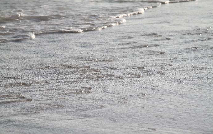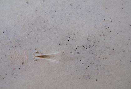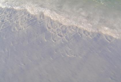 the wet sand as the waves wash up and down the beach. About every few minutes, they will extend two featherly "feeder" antennas to collect organic debris in a receding beach wave' This characteristic V shape wave each flea makes with its feeder antennas during the receding waves is the prime way to find the colonies. |