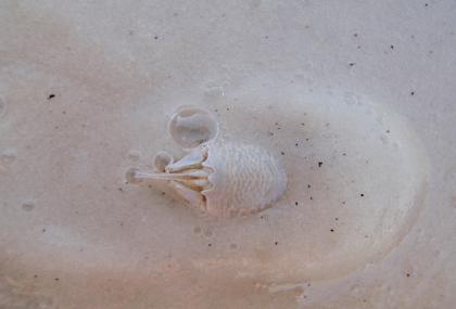 In your search for the elusive Sand Flea (mole crab), you will run across other creatures. One crab, the Beach Mole Crab (Albunea paretii) is often called a "Male" Sand flea but is a totally different fellow. They make good bait but dont stay on your hook as good as the sand flea. |