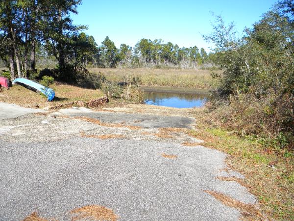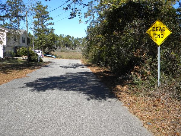 Looking north toward the boat ramp. Residential house on the left of the picture, vacant lot on right. No turn around area.