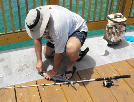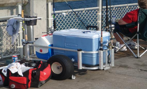 What you take depends on a lot of factors, ie, what fish you are targeting, time of the year, your preference. This is just a guide to start with and is not the final answer. 1. Three rod & reels a. Light weight rod/reel/line for catching bait, throwing Pompano jig, Gotchas, etc. - ROD: 7' Light action - REEL: Light weight spinning or bait casting reel - LINE: 8 to 12# test, monofilament or braid b. Medium weight rod/reel/line rigged for free-lining for King Mackerel and other larger predators. - ROD: 8-9' Medium action - REEL: Medium action spinning reel, ie Penn 750ssm - LINE: 20 TO 30# test, monofilament c. Medium weight rod/reel/line rigged for throwing lures to Spanish Mackerel, Cobia, etc. - ROD: 8 - 9' Medium action - REEL: Medium action spinning reel, ie Penn 750ssm - LINE: 20 to 30 # test, monofilament 2. Pier Cart to carry your tackle, cooler, etc. Let's face it, you have to walk a long way with a lot of stuff. If you are just going to fish the pier a few times a year, borrow a kid's wagon and pull all your stuff in it. If you think you will be going more often, invest in one of the wheeled fishing carts made for this. They sell them at Walmart and the tackle stores. 3. Tackle box or tackle bag with your terminal tackle and lures: a. 3 - 4 Gotchas, rigged with 2-3' 40# fluorocarbon leader or wire leader. Chrome/red, Chrome/Green, White/Red b. 3 - 4 Pompano jigs, your choice. White head with pink tail always a good one. Tied directly to your main line, no leader required. c. 3 - 4 Wire King Mackerel rigs for free lining live bait. Most people around here use a 2 treble hook rig on Malin wire. They also sell these at the pier. d. Chicken (Dropper) rigs or Pompano bait rigs: There are not many types of fish to catch on a bottom rig at the pier except for bait, hardtails, and catfish. No grouper or snapper. But your young kids will love catching things on them. You can catch Pompano and Whiting just outside the surf line using a smaller version of a Chicken rig tipped with a piece of freshly peeled shrimp. They sell these at the Pier also. e. Egg sinkers, 2, 4, 6 oz f. Pyramid sinkers, 2, 4, 6 oz Pompano Rig g. Circle hooks, 2/0, 4/0, 6/0 as needed h. Swivels, 80# i. 3- 4 Bubble rigs (Rigged with Gotchas, McDonald straws, etc as desired.) j. Bait as desired (Squid, shrimp, etc) k. Needle nose pliars l. Dehooker m. Knife n. Three to four packages of # 6 or # 8 hook Sabiki rigs if you plan to catch live bait LEFT: Sometimes it helps to bait the sabiki hooks small pieces of squid. RIGHT: Sabiki hook rigs 4. Back pack or shoulder bag to carry everything in. 5. Hat 6. Polarized sunglasses 7. Water and other beverage of choice 8. Sun Block 9. Flashlight for night fishing 10. Cooler with ice. Very important to keep your fish iced to keep it fresh. If possible, use a different cooler for your drinks and food. If you have to use the same one as your fish, put your drinks and food in a plastic bag, but they will still probably smell like fish. 11. Bridge/pier gaff with rope or hoop net. For the large fish. You will not be able to pull up a large fish on just your fishing line. Most times someone on the pier will have one and will help your, but you can not depend on it. If you have none, you will just have to walk the fish down the length of the pier to the beach, or break him off. LEFT: Hoop Net RIGHT: Bridge/Pier Gaff 12. Food as desired 13. Towel for holding fish, wiping hands. 14. Measuring stick. The Florida Sportsman magazine produces a measuring stick, called the Law Stick, that is stamped with the appropriate size limits for Florida's saltwater fish and is real handy. These are sold at Walmart, Bass Pro, and other tackle and bait stores. Half Hitch Tackle also has their own version. 16. Copy of Florida Fishing regulations with size limits, etc. You can pick up at copy at Walmart, other sporting stores, or by ordering/printing from the FWC online at: FLORIDA SALTWATER FISHING REGULATIONS NOTE: Fishing regulations change often. Check the FWCs Hot Topics site for the latest: FWC HOT TOPICS To print a Pier checklist, click here: PIER FISHING CHECKLIST |