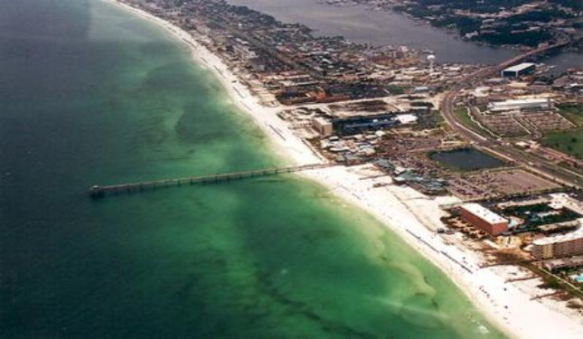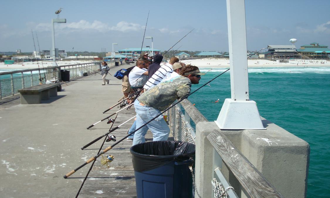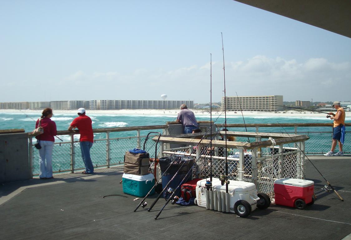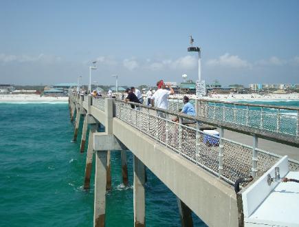Island Fishing Pier The Okaloosa Island Fishing Pier pier is a 1262' long concrete pier located about 4 miles west of the Destin Bridge. It is an excellent place to go for a shorebound fisherman to catch a wide variety of saltwater fish or to just spend some time enjoying the salt air. It is a popular place in the summer, as tourists stroll the plankings checking out the views and fishing. Daily Report |