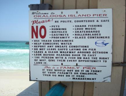 | Okaloosa Island Pier Hours of Operation: Mid October through mid March: Daily 5 a.m. to 9 p.m. Mid March through Mid October: Open 24 hours Rates: All daily admissions are good from the time you enter the pier until midnight. A wrist band will be issued to you that allows you to come and go through the day at no additional charge as long as you have the band on. DAILY RATES: If you are going to fish: Adults $ 7.00 Seniors 65+ $ 6.00 Children 6-12 $ 4.00 5 and under FREE If you are not going to fish: (Spectators, visitors, anyone not fishing) Age 6 and up: $ 1.00 5 and under FREE ANNUAL RATES: Adults: $ 240.00 Seniors (65 +) $ 175.00 Children (6 to 12) $ 175.00 Prices include tax and fishing license. Rods and reels rent for $7.00 for a medium and $8.00 for a large. |
