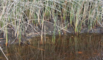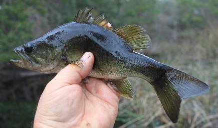 shore. It is covered with grass and drops off quickly to a few feet. Looked to be about 7' deep in the middle and water temperature was 57 F. Had no luck on deep running crank baits, worms, or spinner baits. I have heard that junebug, watermelon, green pumpkin were good colors for worm, but no luck today.