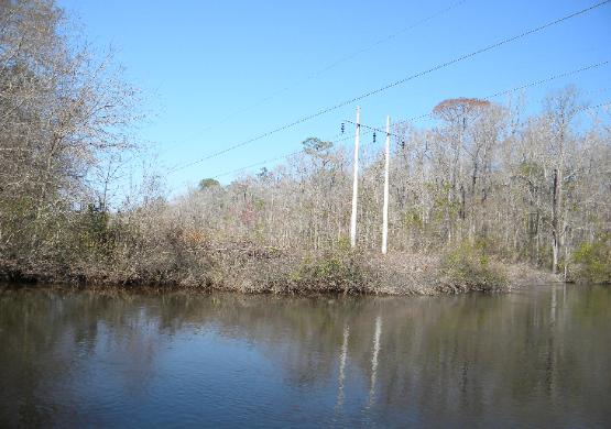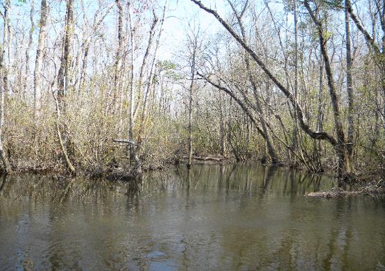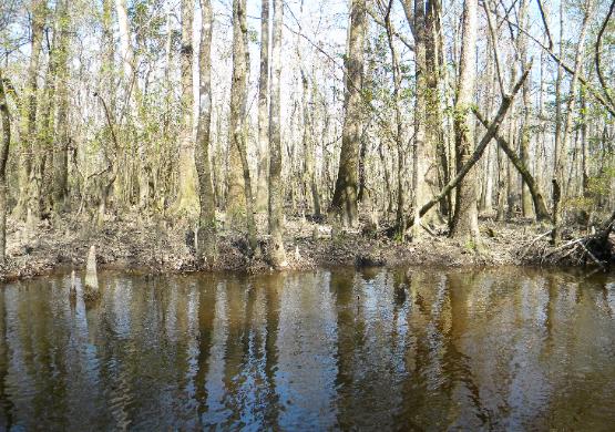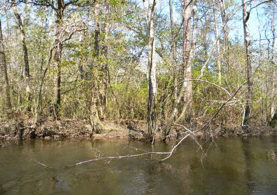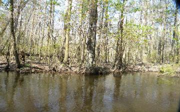 them. The land surrounding the river is not much higher than the river itself and floods. Banks are muddy with a lot of underbrush and trees.